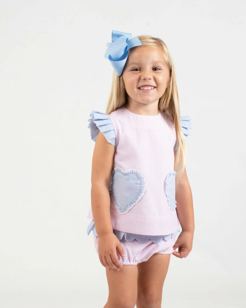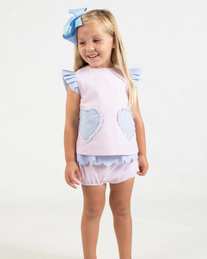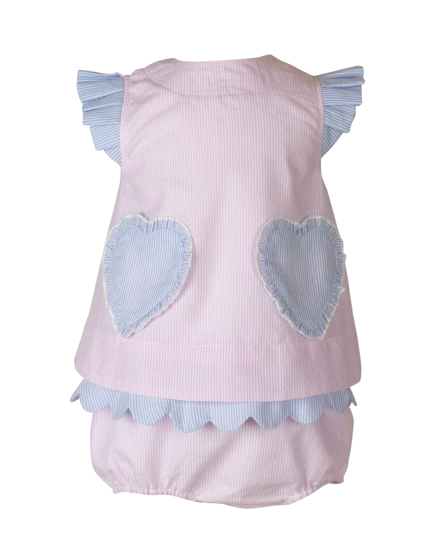 Pink seersucker top with tailored flutter sleeves and adorable ruffled front heart pockets both in blue seersucker.Β Β Pink seersucker bloomers with with blue scalloped ruffle around elastic waist.