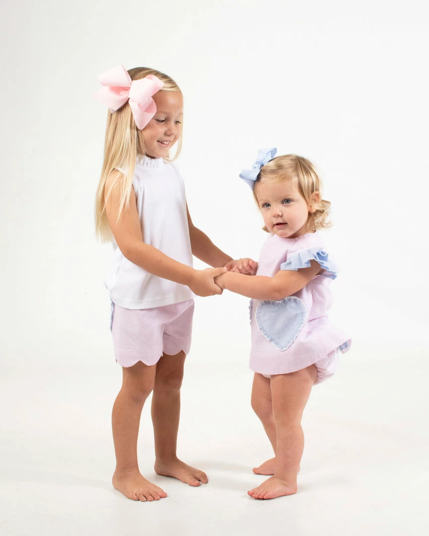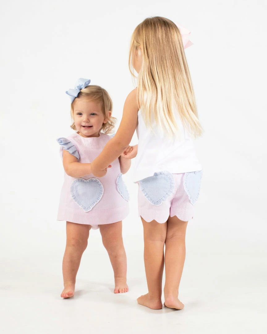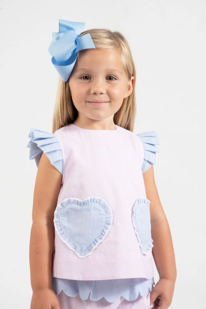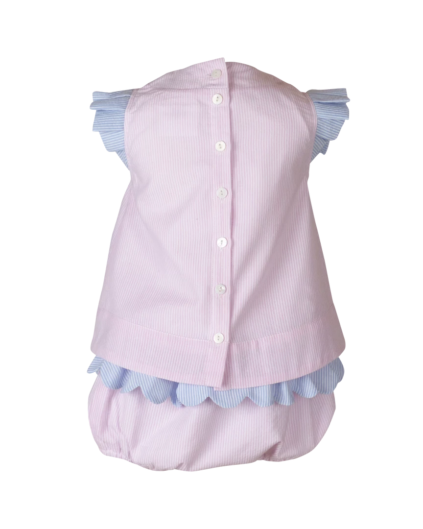 Pink seersucker top with tailored flutter sleeves and adorable ruffled front heart pockets both in blue seersucker.Β Β Pink seersucker bloomers with with blue scalloped ruffle around elastic waist.