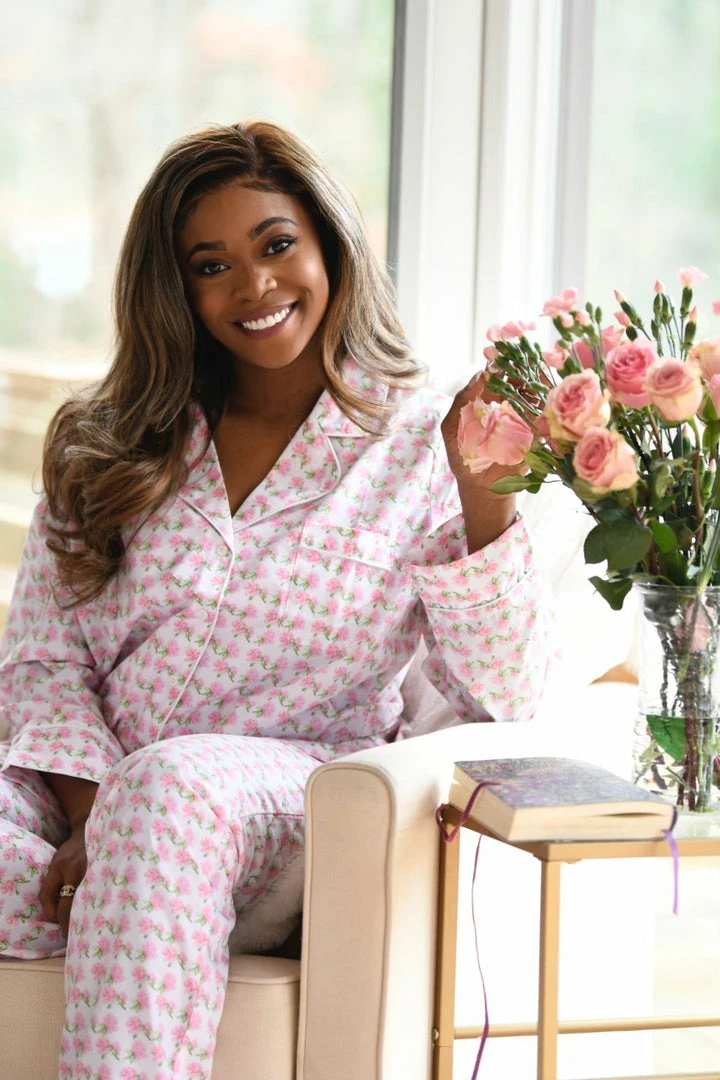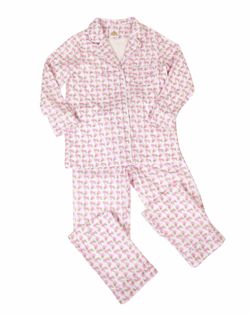 The ultimate classic pajama set for Mom in our Painters Peony custom print in wash and wear broadcloth. The top has a 5 button placket, contrasting piping and front chest pocket. The pants have an elastic waist and self-drawstring in front.