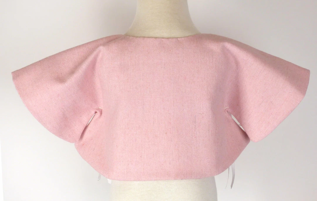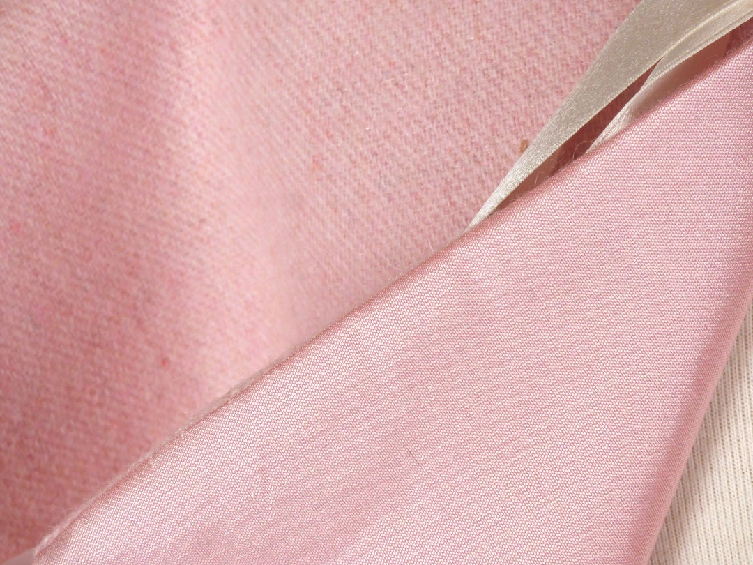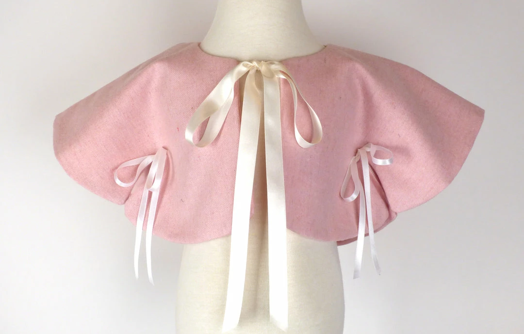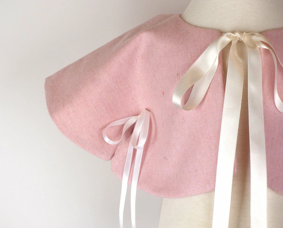 This luxurious cape is made in the finest finishes. The soft pink cashmere wool shell is lined in a coordinating shantung silk with double-faced silk satin ribbon closures. The Catesby Cape is one for the heirloom box for generations to come.