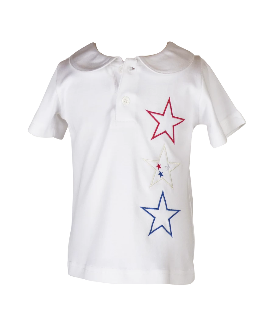 Our classic white shirt with a peter pan collar is always in style. 100% super soft pima cotton knit shirt with piping accents around peter pan collar and straight cuffed sleeves.