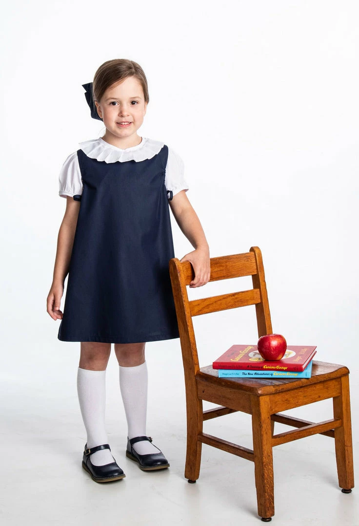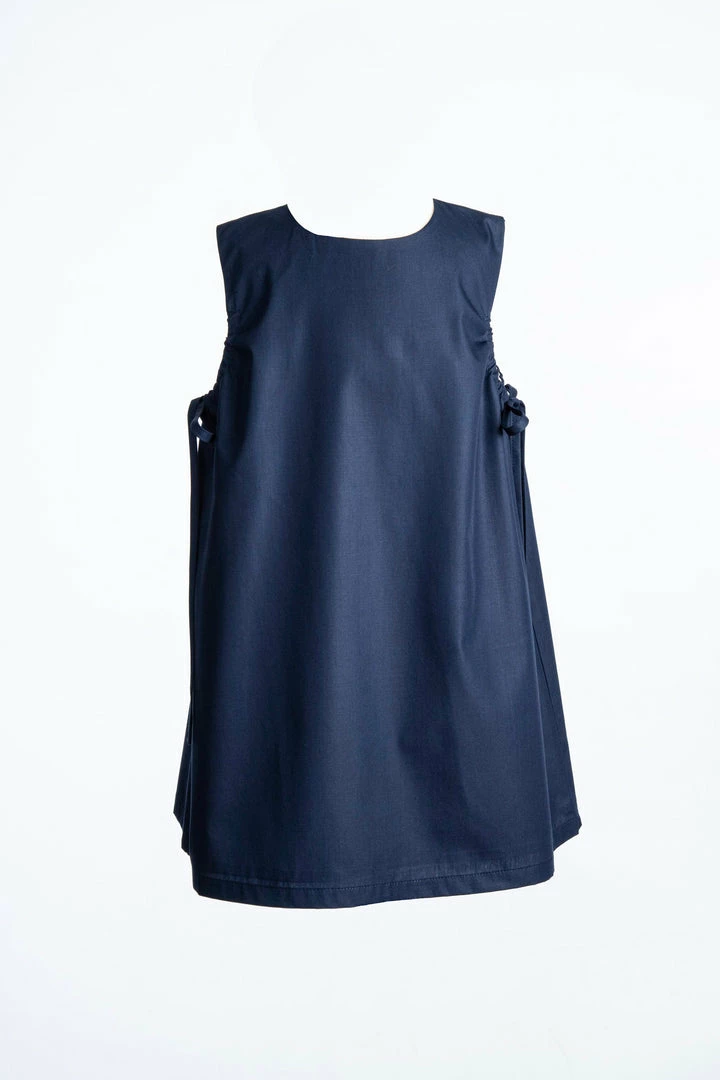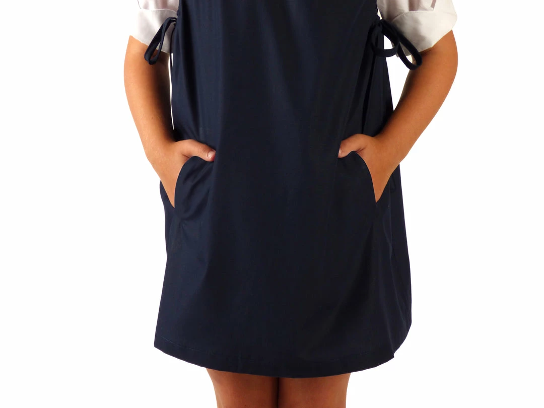 Navy broadcloth jumper with ties under each arm for an adjustable fit and two front slash pockets. Fully lined. One button closure. Poly/Cotton.
