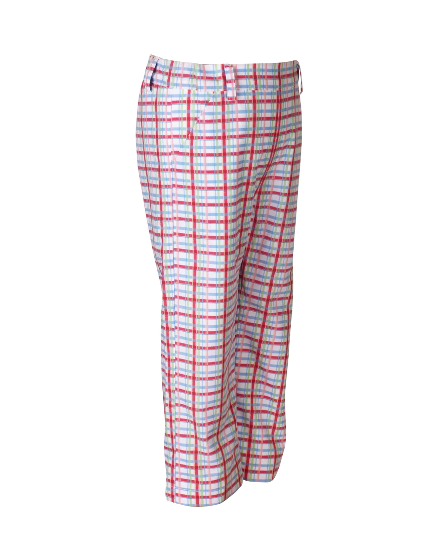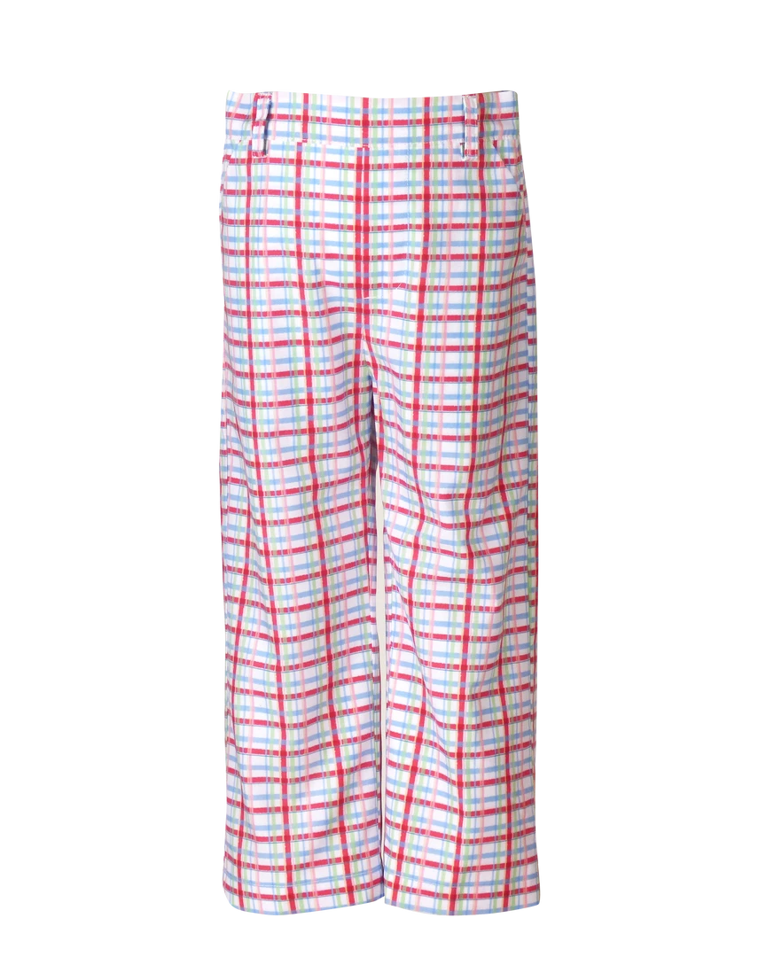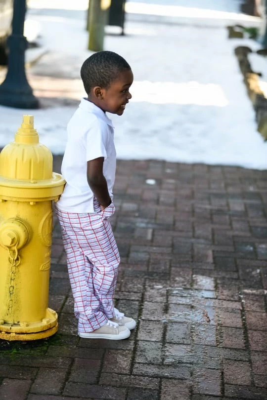 Classic cut transitional boy pant in Palmer Plaid custom print.ย Flat front, side pockets, faux zipper, belt loops and an adjustable elastic waistband.