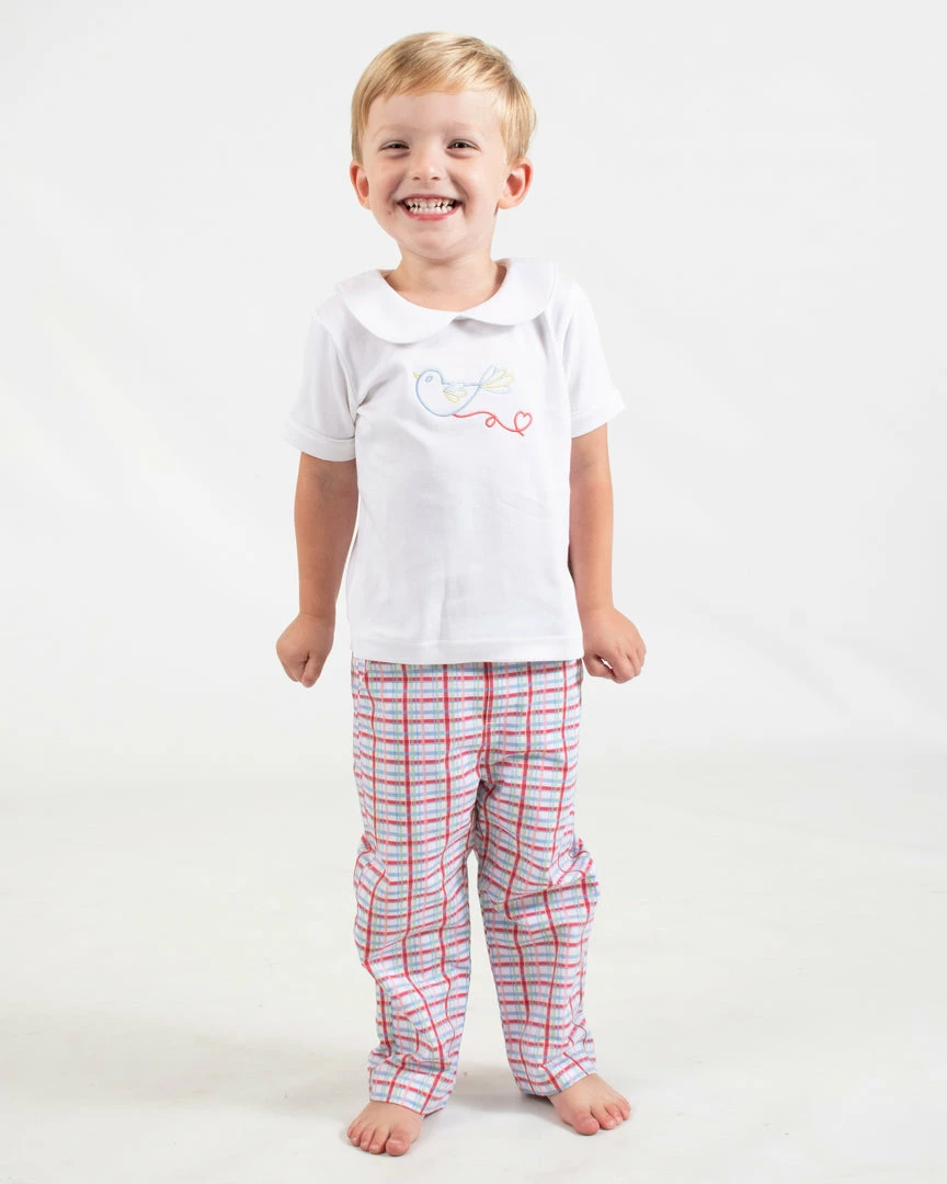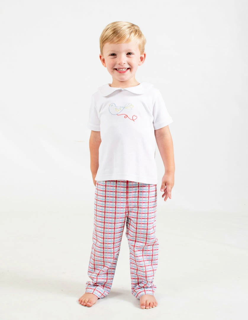 Pair with our Peter PPC or Parker Shirt!ย See Charlotte Dress in Lovey Dovey with Pantaloons for a little sister match or the Chloe or Sally Sundress in Palmer Plaid.ย Also see the Reagan Jon Jon in Palmer Plaid, Palmer Plaid Diaper Cover or Shorts with coordinating Peter PPC shirt with Lovey Dovey embroidery for little or big brother!