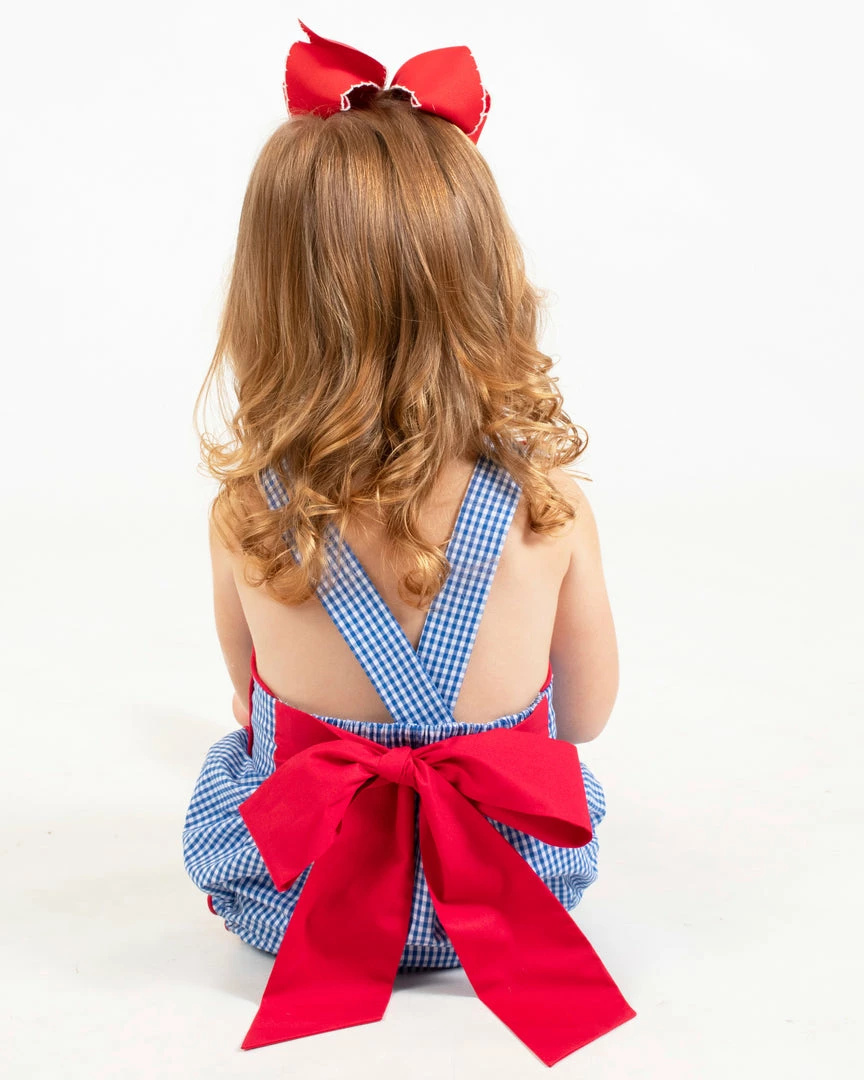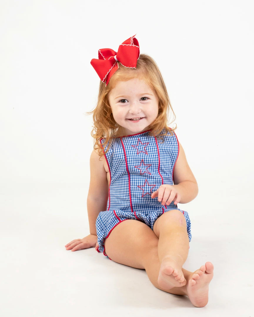 Somerset Sunsuit in blue gingham with red piping accents and a red sash bow in back.ย A three red star hand embroidered design down front yoke.
