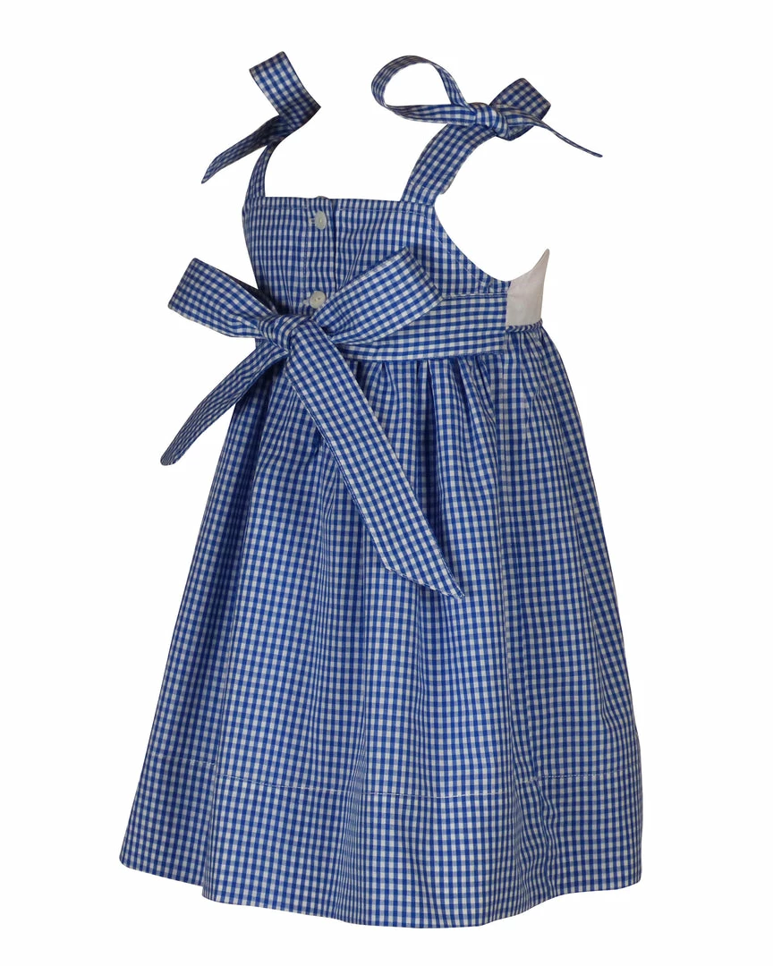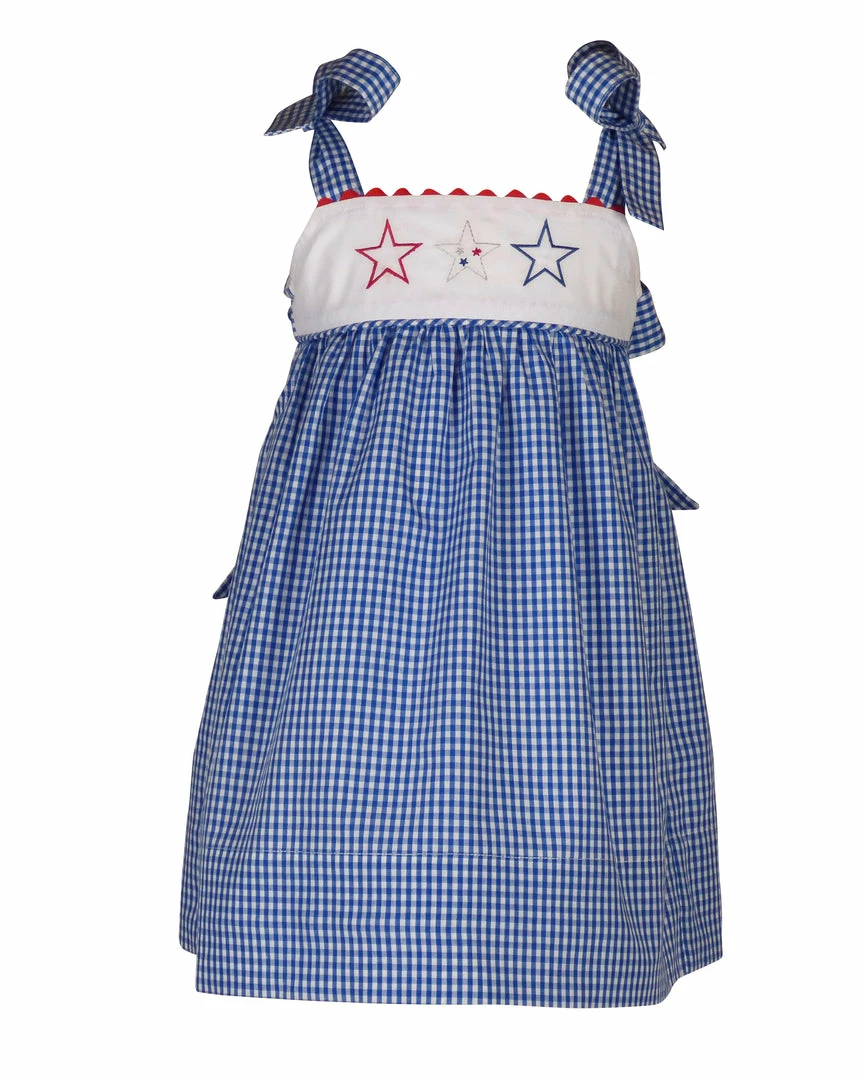 Knee length blue gingham sundress with shoulder ties, sash bow in back and star embroidery and red ric ric accents on front yoke. Coordinating blue gingham bloomers.